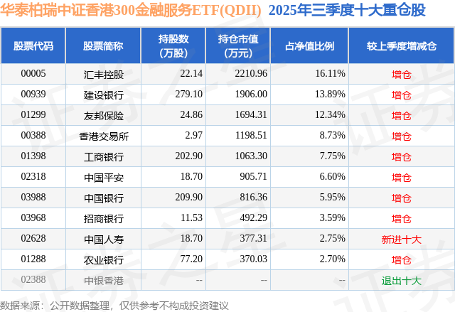 本站消息,日前华泰柏瑞中证香港300金融服务ETF(QDII)基金公布三季报中国十大股票配资公司,2025年三季度最新规模1.37亿元,季度净值涨幅为3.88%。